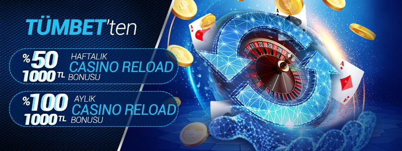 Tümbet’te casino oyuncuları her zaman kazançlı ve daha şanslı. Tümbet’in en yeni promosyonlarından bir tanesi olan  Haftalık %50 Tümbet Casino Reload Bonusu ile istediğiniz herhangi bir yatırım yöntemi ile yapacağınız yatırımlarınıza 1000 TL’ye kadar bonus alabilrsiniz.